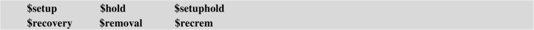 时序检查可以放在指定块中,通过确保关键事件在给定的时间限制内发生来验证设计的时序性能。为了方便起见,将时序检查分成两组。第一组时序检查是根据稳定性时间窗口描述的: