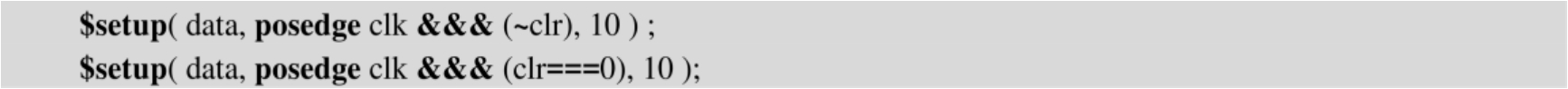 该例子给出了触发相同时序检查的两种方法。第一种方法,只有clr为低时,在clk上升沿到来时,才执行建立时序检查;第二种方法,使用===运算符,这使得条件的比较结果是确定的。