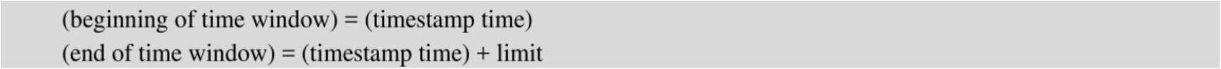 其中,data_event为时间戳或时间检查事件;reference_event为时间戳或时间检查事件;limit 1为非负常数表达式;limit 2为非负常数表达式;notifier(可选)为Reg;event_based_flag(可选)为常数表达式;remain_active_flag(可选)为常数表达式。