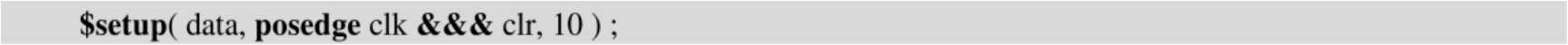 此处,在信号clk的每个上升沿到来时,执行建立时序检查。如果只有在clr为高时,在信号clk的每个上升沿到来时执行时序检查,将上面的命令重新写为