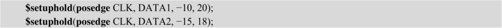 其中,reference_event表示当建立限制条件的值是正数的时候,为时间检查事件或者时间戳事件;当建立限制条件的值是负数的时候,为时间戳事件。data_event表示当保持限制条件的值是正数的时候,为时间检查事件或者时间戳事件;当保持限制条件值是负数时,为时间戳事件。setup_limit为常数表达式;hold_limit为常数表达式;notifier(可选)为Reg;timestamp_cond(可选)为用于负的时序检查的时间戳条件;timecheck_cond(可选)为用于负的时序检查的时间检查条件;delayed_reference(可选)为用于负的时序检查延迟的参考信号;delayed_data(可选)为用于负的时序检查延迟的数据信号。$setuphold时序检查可以接受限制值为负数的条件。此处,数据事件通常是一个数据信号,而参考事件通常是一个时钟信号。当建立限制和保持限制的值均为正数时,参考事件或数据事件可作为时间检查事件,这将取决在仿真时首先发生的事件。