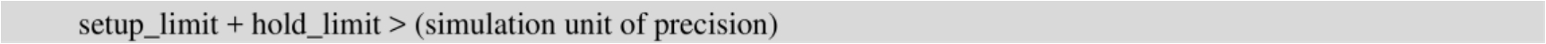 对负的时序检查值,可以会出现相互之间的不一致,并且对于延迟信号的延迟值没有解决的方法。在这些情况下,仿真器将产生警告信息。可以将最小的负限制值改为0,并且重新计算延迟信号的延迟,并且通过反复计算直到找到一个解决方案为止。这样,可以解决不一致的问题。因为在最坏情况下,所有负的限制值都变为0,不需要延迟信号。所以,这个过程总是可以找到一个解决方案。