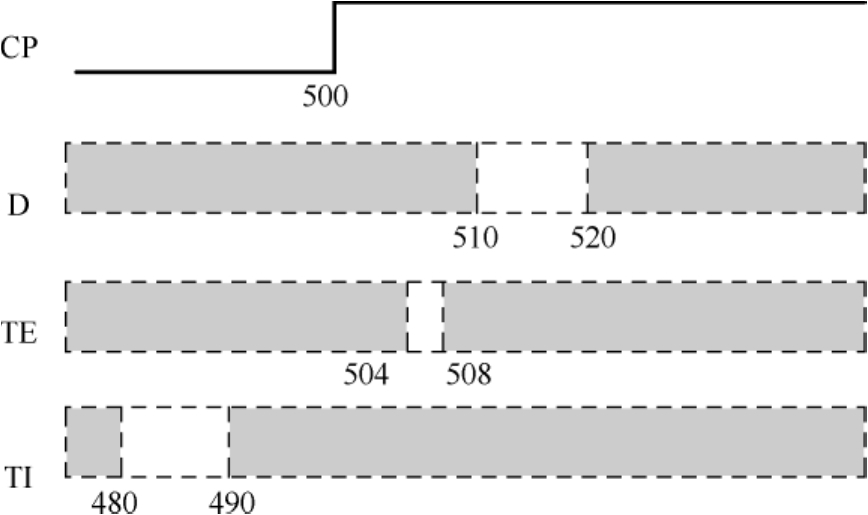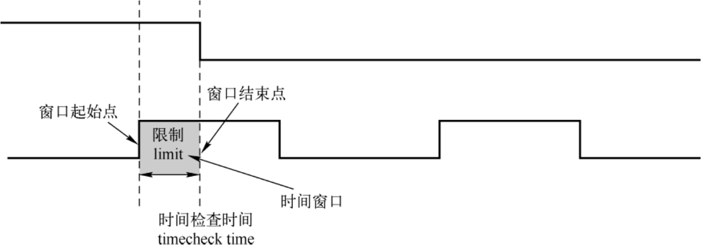 此处,参考事件(时间检查事件)通常是一个控制信号,如清除(clear)、复位(reset)或置位(set),而数据事件(时间戳事件)通常是一个时钟信号。时间窗口的起点和终点由下式确定: