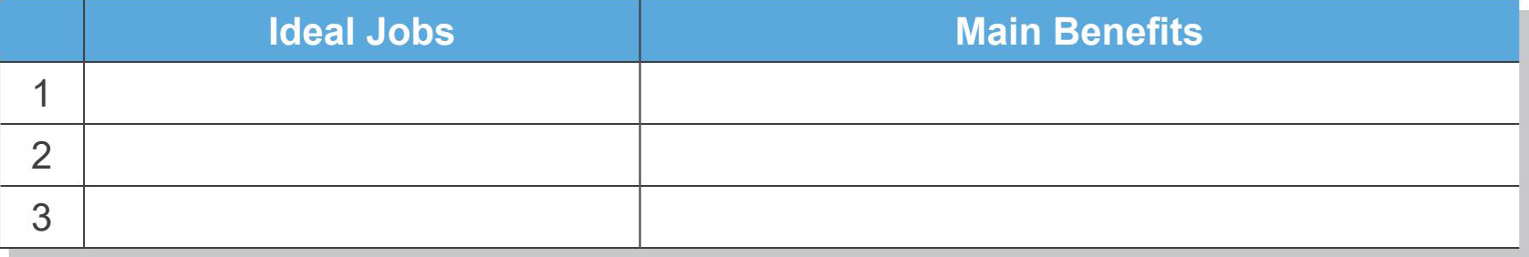 Search to find out what ideal jobs would be like before class and fill in the table with the information you have got.