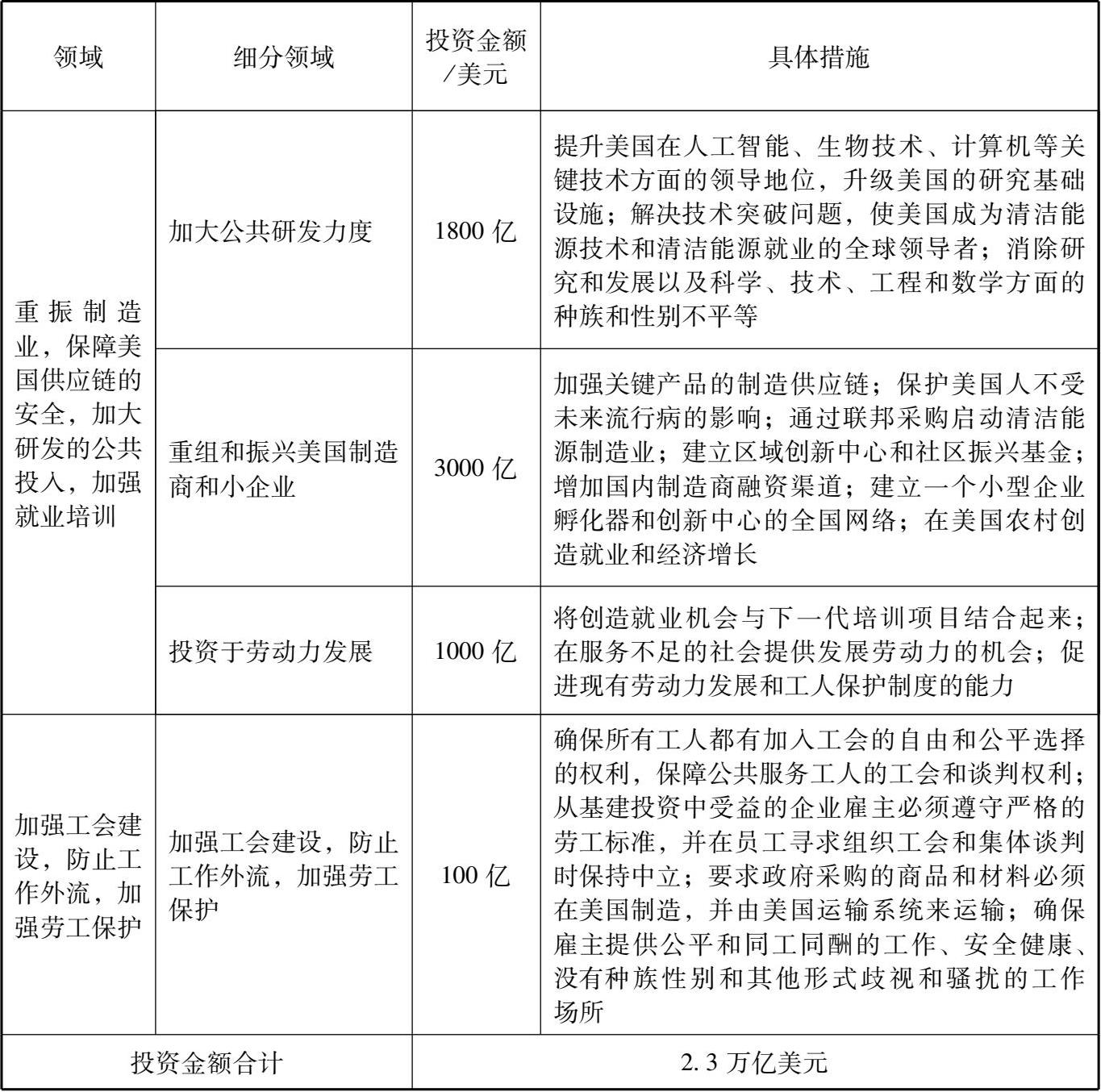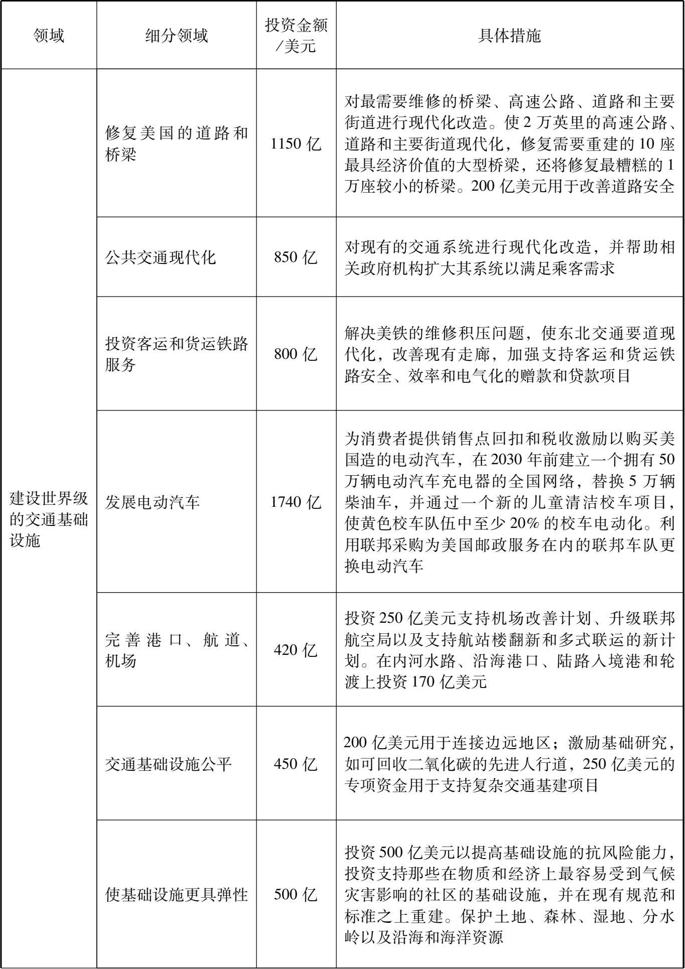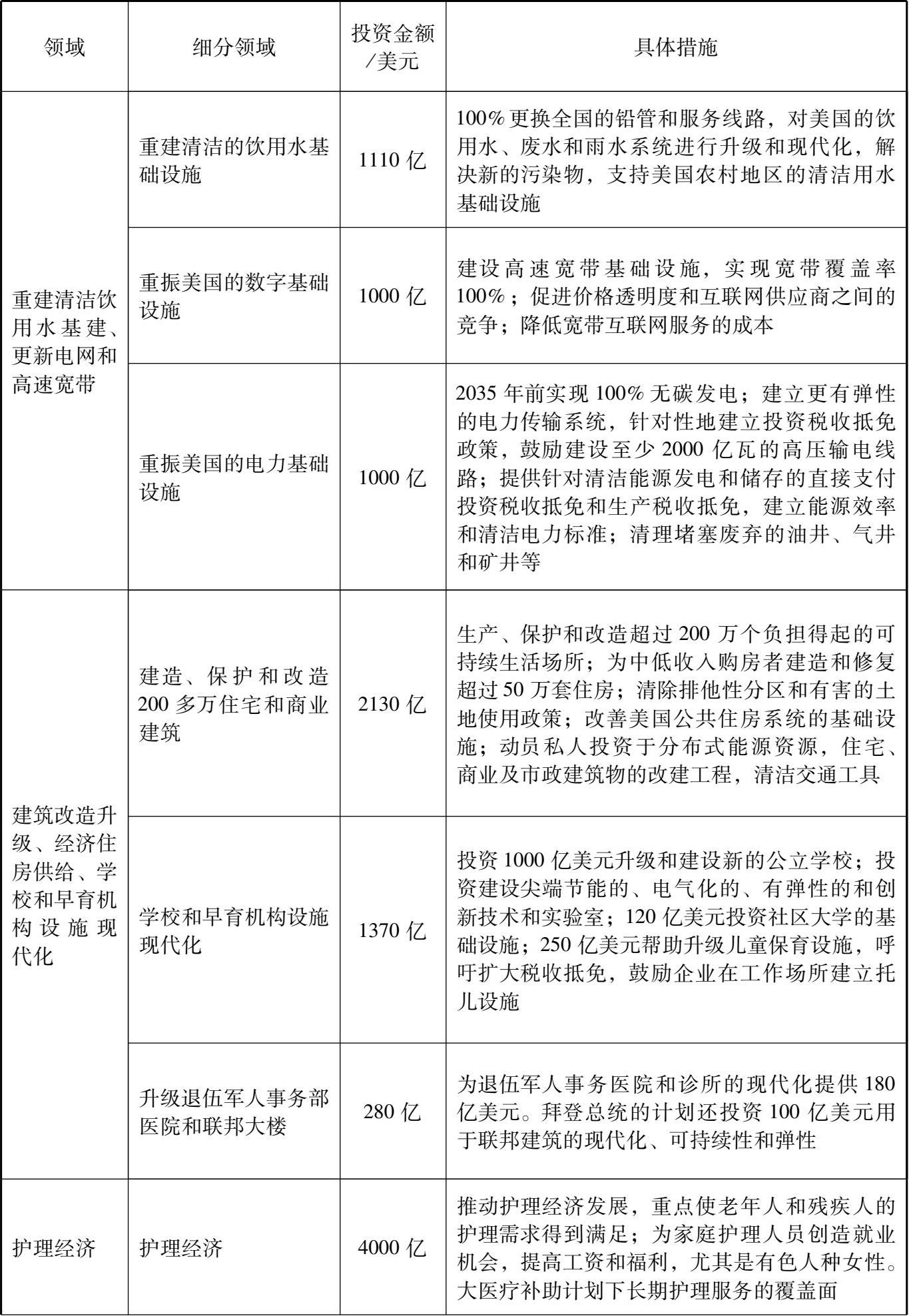 从“美国就业计划”内容看,主要是通过实施基础设施建设一揽子计划,以升级美国现有基础设施,刺激经济复苏并创造就业,其核心内容为通过巨量的气候友好型基础设施建设为美国人民创造大量的优质就业机会。主要包含六个方面:一是修复高速公路,重建桥梁,升级港口,机场和运输系统(规模为6710亿美元);二是提供干净的饮用水、更新的电网和高速宽带(规模为3110亿美元);三是建筑改造和升级(规模为3780亿美元);四是发展护理经济,提高护工工资和福利(规模为4000亿美元);五是重振制造业,保障美国供应链的安全,加大研发的公共投入,加强就业培训(规模为5800亿美元);六是加强工会建设,防止工作外流,加强劳工保护(规模为100亿美元)具体见表2-2。