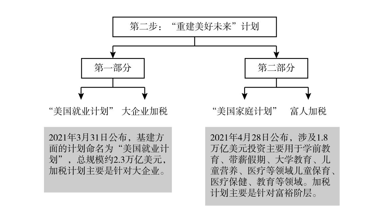 2021年3月31日,拜登在宾夕法尼亚州匹兹堡市发表演讲,表示“重建美好未来”计划具体包括“美国就业计划”和“美国家庭计划”两个部分,见图2-1。