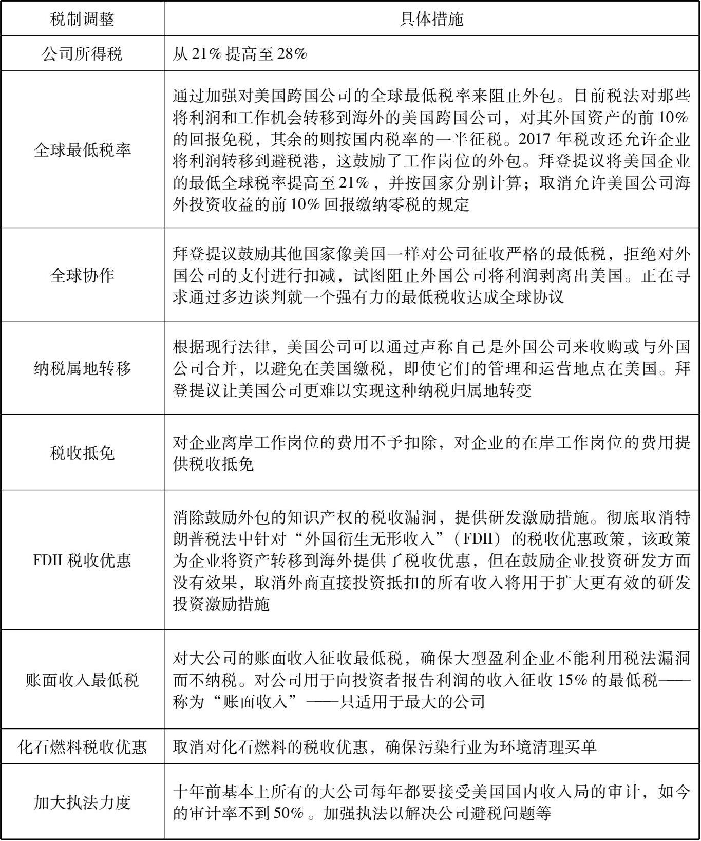 2021年4月7日,美国财政部发布了“美国制造税收计划”报告(见表2-3),着重于取消离岸投资激励措施、减少利润转移、反击公司税领域竞争,并为清洁能源的生产提供税收优惠政策。该计划与拜登的2.3万亿美元“美国就业计划”中的增税要求相配套。美国财长耶伦表示,“本次税改计划对所有美国人都更加公平,有利于消除公司将投资和利润向海外转移的动机,并将筹集更多的资金以满足美国国内需求。”该税改计划预计未来15年间将为美国带来约2.5万亿美元的额外收入,进而支持拜登旨在投向基础设施、社会福利等领域的8年支出计划。