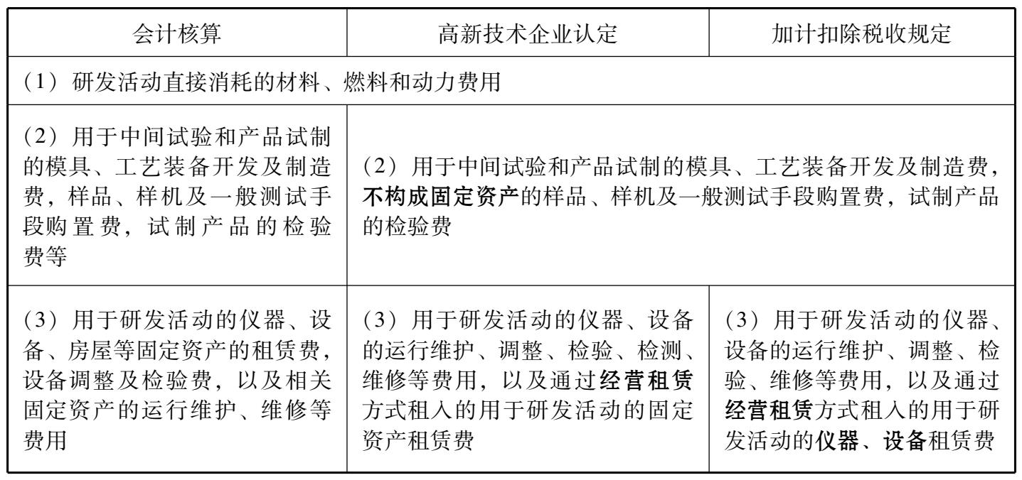 如表2-2所示,直接投入费用口径的主要差异在于房屋的租赁费、运行维护、维修等费用是否归集。会计核算口径中,用于研发活动的固定资产(包括房屋)的租赁费、运行维护、维修等费用可以计入研发费用;高新技术企业认定口径中,房屋等固定资产的运行维护、维修等费用不计入,通过经营租赁租入的用于研发活动的固定资产租赁费计入;加计扣除税收口径中,房屋等固定资产的租赁费、运行维护、调整、检验、维修等费用不计入。
