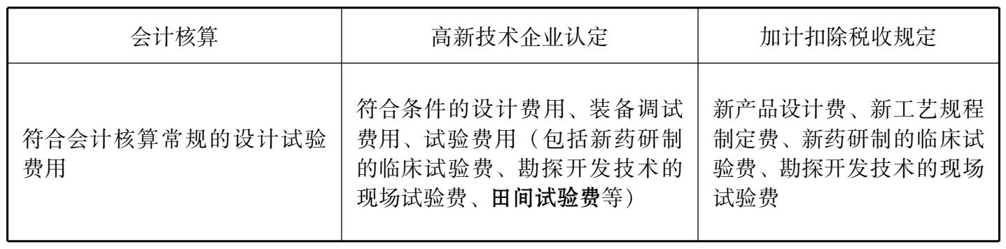 如表2-5所示,会计核算口径中,根据会计核算的相关性原则,研发活动发生的相关设计试验费用支出在研发支出核算。高新技术企业认定口径中,研发费用包含装备调试费用和田间试验费,而加计扣除税收规定口径的研发费用范围限于表中正列举范围。