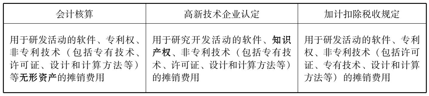 如表2-4所示,会计核算口径和加计扣除税收规定口径的研发费用包含“专利权”摊销费用,而高新技术企业认定口径的研发费用包含“知识产权”摊销费用。二者存在一定差异。