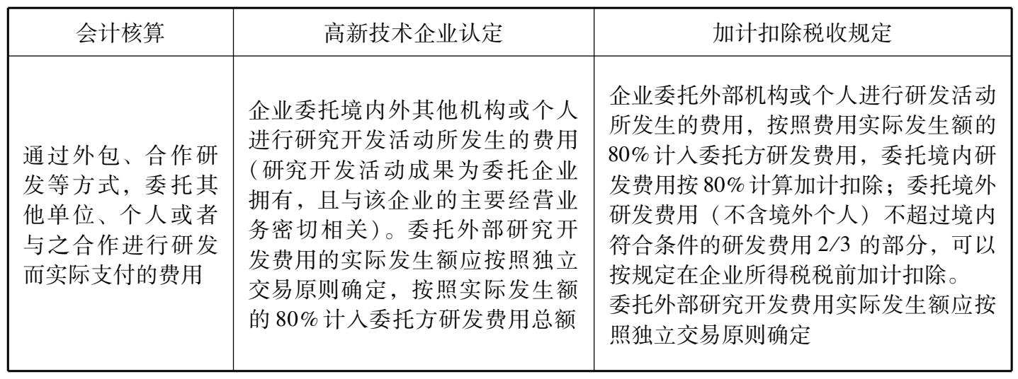 如表2-7所示,会计核算口径中,企业实际发生的委托研发支出全额在研发支出中核算。高新技术企业认定口径中,委托外部研究开发费用的实际发生额应按照独立交易原则确定,按照实际发生额的80%计入委托方研发费用总额。加计扣除税收规定口径中,委托外部研究开发费用的实际发生额应按照独立交易原则确定,委托境内研发费用按照实际发生额的80%加计扣除,委托境外研发费用不超过境内符合条件的研发费用2/3的部分,可以按规定在企业所得税税前加计扣除。