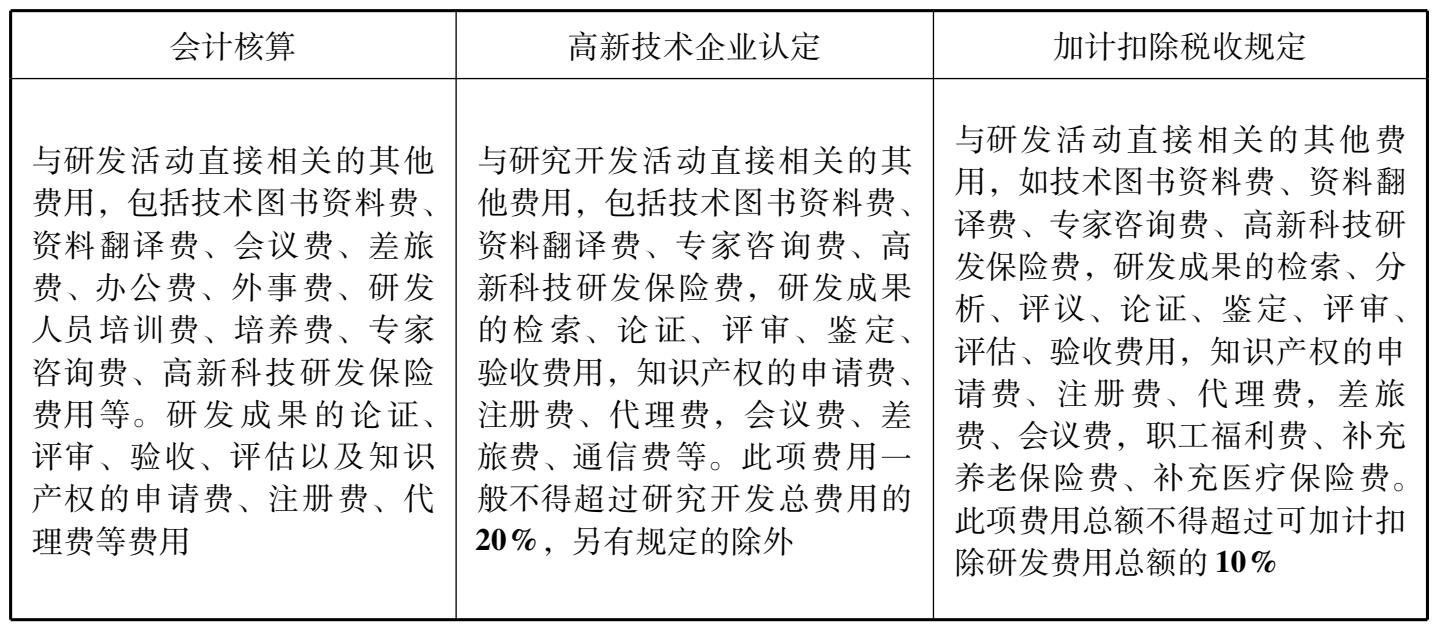 如表2-6所示,会计核算口径中,其他相关费用包括办公费、外事费、研发人员培训费、培养费等,且对其他相关费用总额无比例限制。高新技术企业认定口径中,其他相关费用总额的限制比例为20%。加计扣除税收规定口径中,其他相关费用总额的限制比例为10%,并且加计扣除研发费用范围限于表中正列举范围。