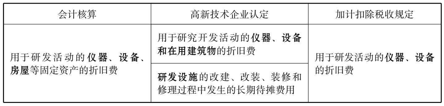 如表2-3所示,会计核算口径中,研发使用的房屋折旧费计入研发支出,但房屋折旧费不计入加计扣除税收规定口径。高新技术企业认定口径中,在用建筑物的折旧费,研发设施的改建、改装、装修和修理过程中发生的长期待摊费用等可计入,但不计入加计扣除税收规定口径。