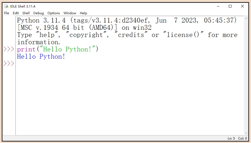 单击IDLE图标,在界面上输入“print("Hello Python!")”,按Enter键运行程序。