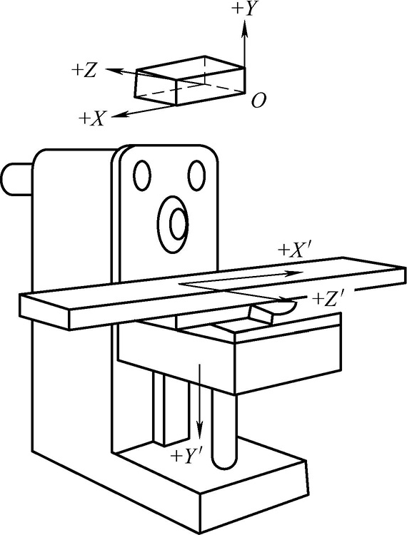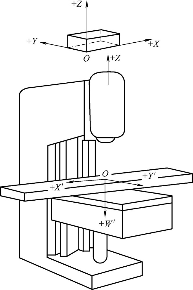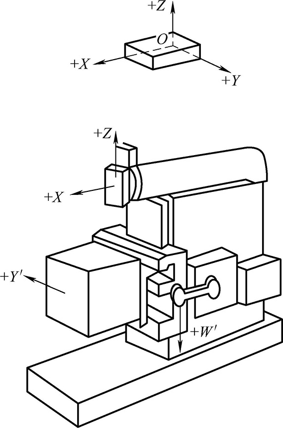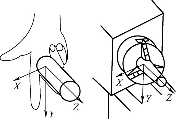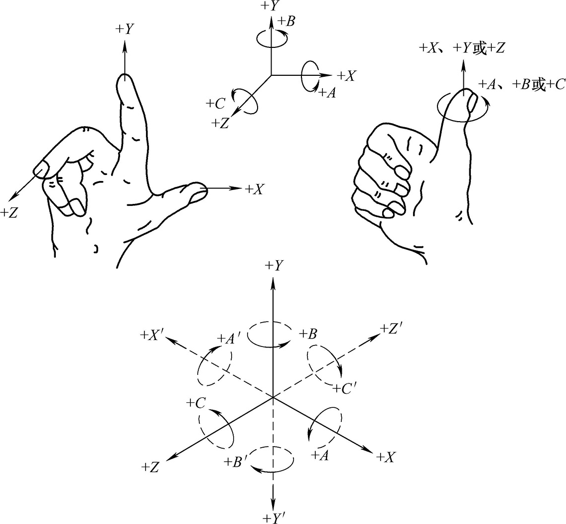 X 、 Y 、 Z 坐标的相互关系用右手定则确定。伸出右手的拇指、食指和中指,并互为90°,则拇指代表 X 坐标,食指代表 Y 坐标,中指代表 Z 坐标。拇指的指向为 X 坐标的正方向,食指的指向为 Y 坐标的正方向,中指的指向为 Z 坐标的正方向,分别用+ X 、+ Y 、+ Z 表示。 A 、 B 、 C 正向根据右手螺旋定则确定,拇指指向 X 、 Y 、 Z 轴的正方向,四指弯曲的方向为各旋转轴的正方向,并分别用+ A 、+ B 、+ C 来表示。与+ X 、+ Y 、+ Z 、+ A 、+ B 、+ C 相反的方向用带“′”的+ X ′、+ Y ′、+ Z ′、+ A ′、+ B ′、+ C ′表示。