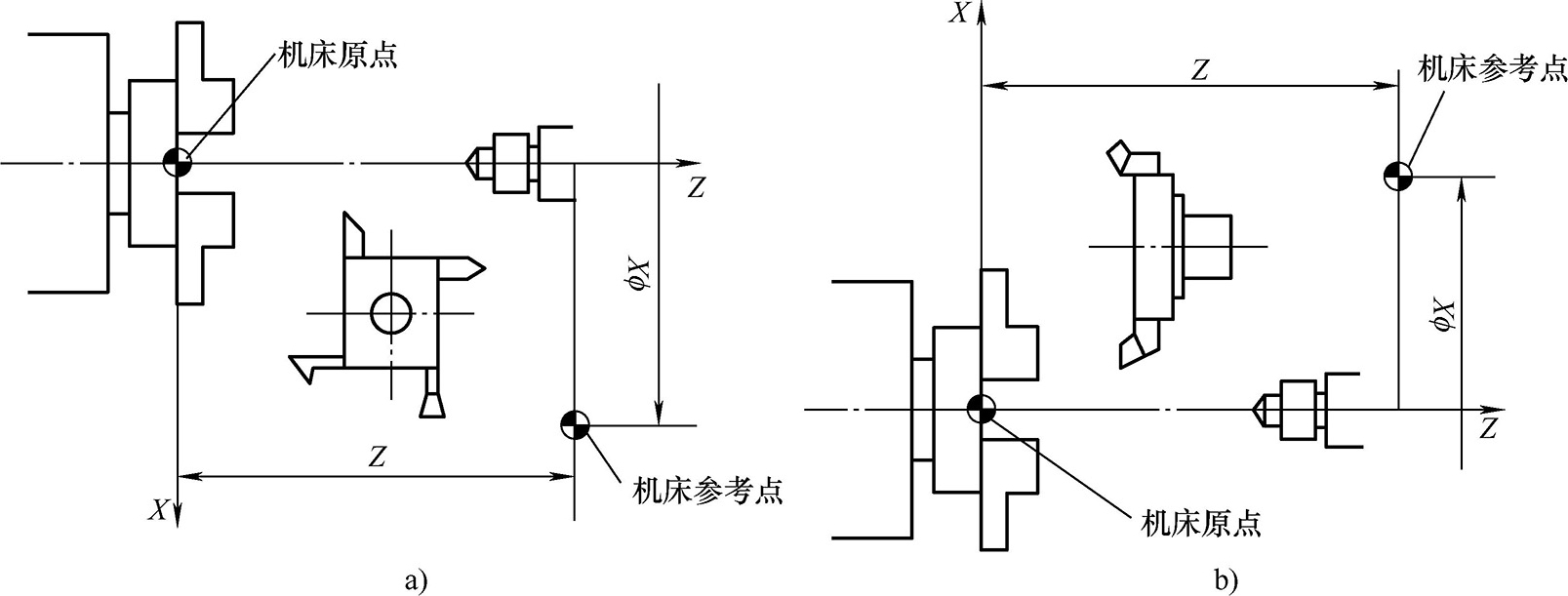 a)刀架前置的机床参考点 b)刀架后置的机床参考点