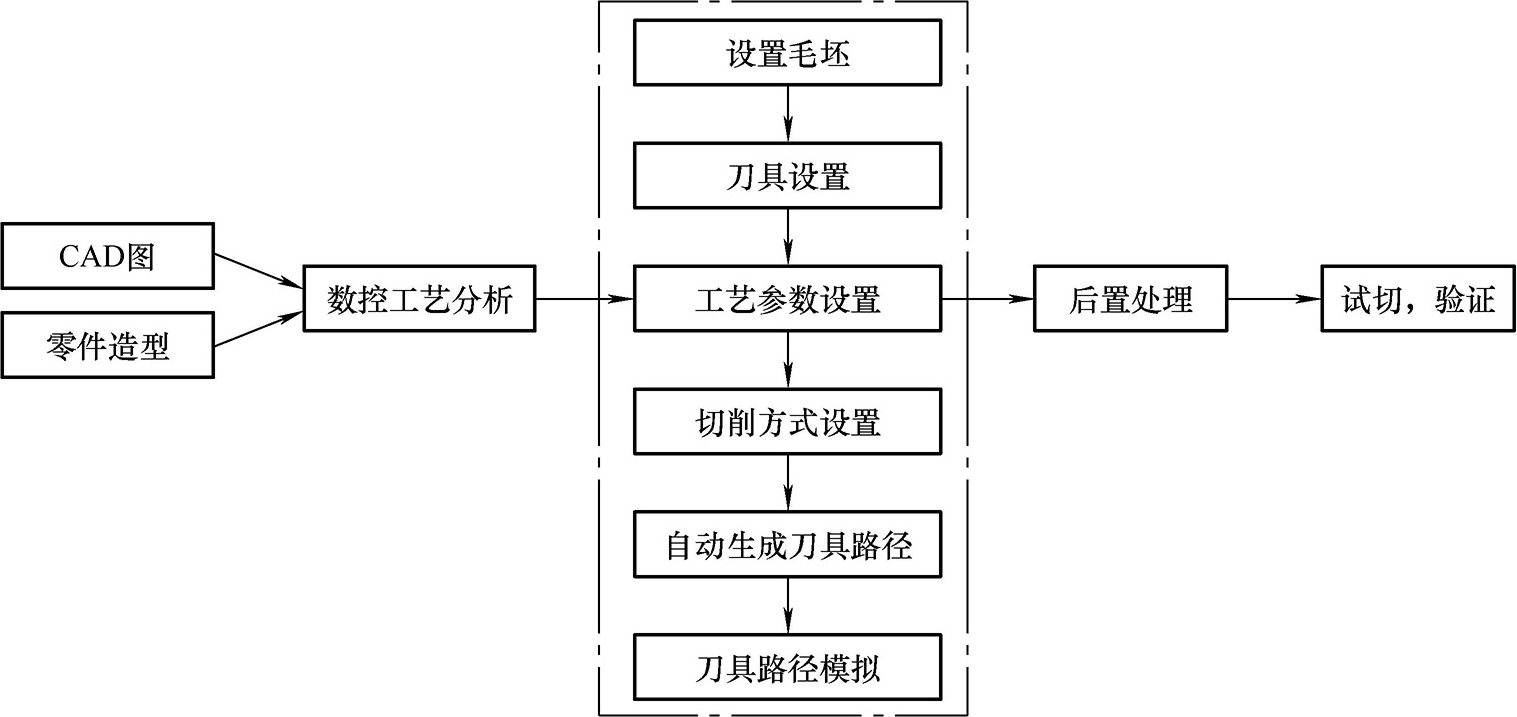 依据零件图及加工要求,将零件全部加工工艺过程及其他辅助动作,按动作顺序,用规定的标准指令、格式,编写成数控机床的加工程序,并进行检验和修改,该过程称为数控加工的程序编制,简称数控编程。数控编程分为手工编程和自动编程两种。