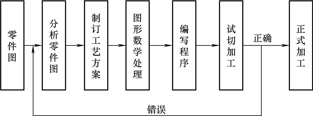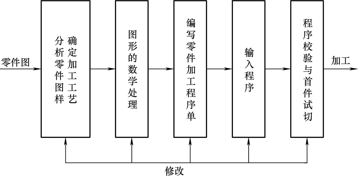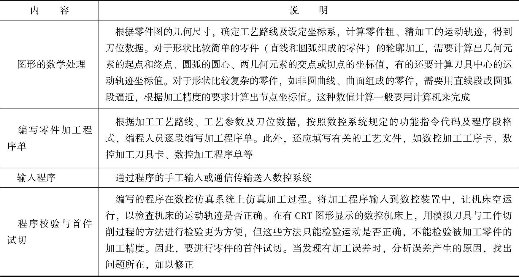 对于形状简单的零件加工,手工编程比较简单,程序不复杂,而且经济、及时。因此,在点定位加工及由直线与圆弧组成的轮廓加工中,手工编程仍广泛应用。手工编程的方法与步骤如图1-46所示。