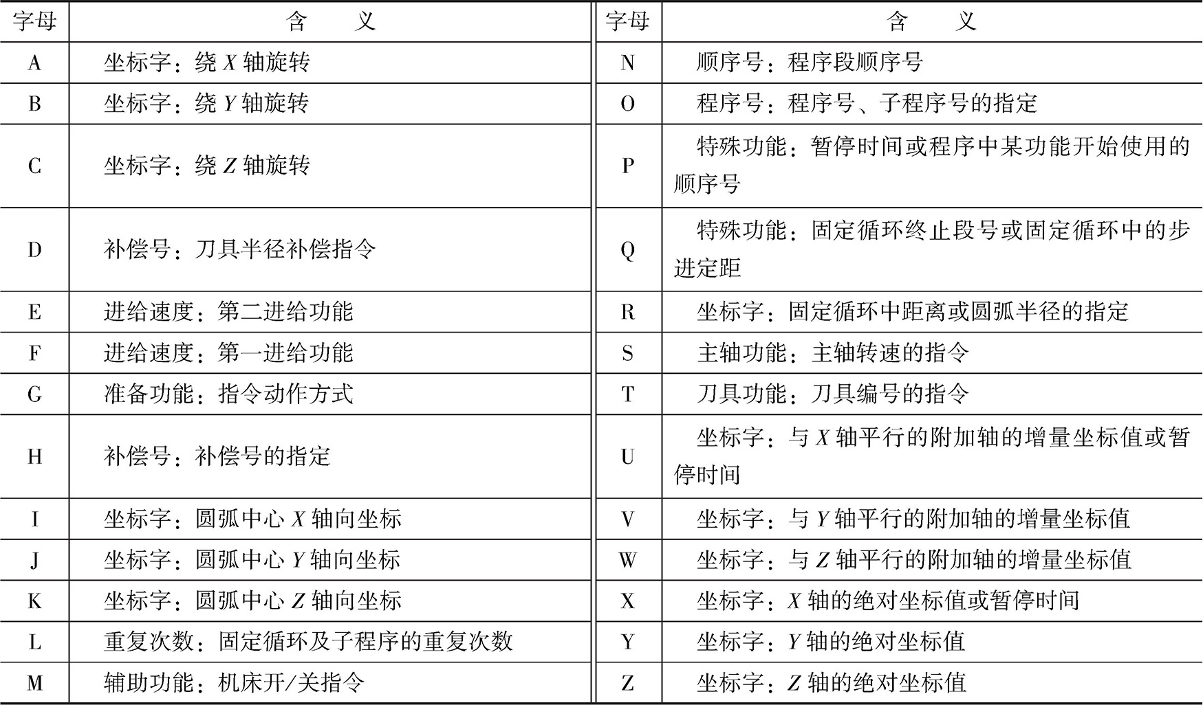 在程序段中表示地址的英文字母可分为尺寸字地址和非尺寸字地址两种。表示尺寸字地址的英文字母有X、Y、Z、U、V、W、P、Q、I、J、K、A、B、C、D、E、R、H共18个字母;表示非尺寸字地址的有N、G、F、S、T、M、L、O 8个字母,其含义见表1-8。