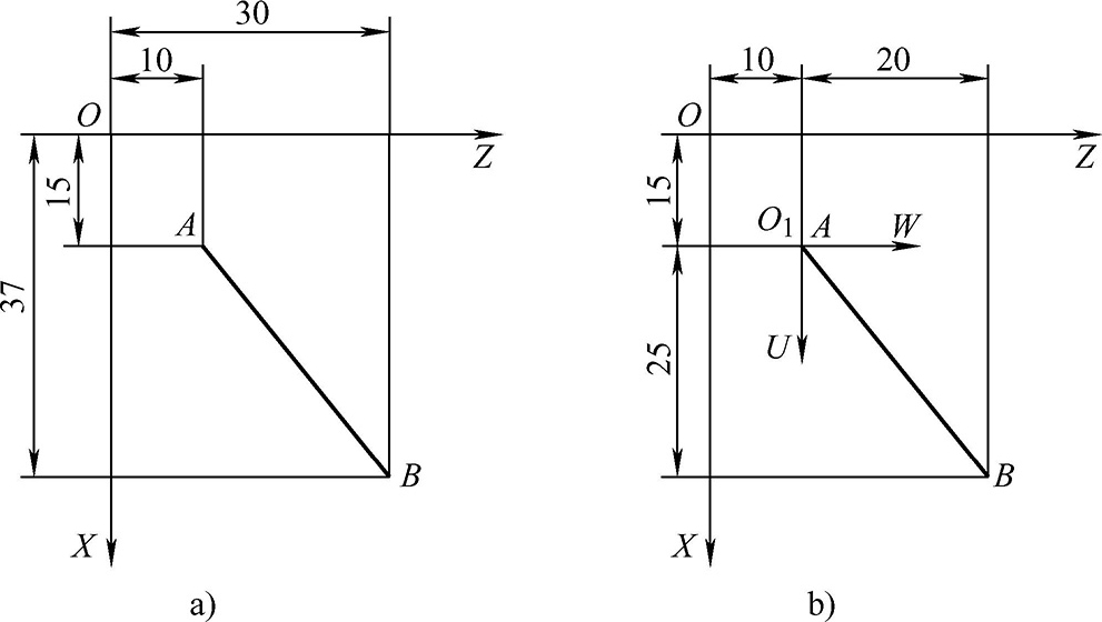 一种是绝对坐标编程方式,另一种是增量(相对)坐标编程方式。在绝对坐标编程方式中,编程终点的坐标值和运动位置的坐标值是相对于固定坐标原点给出的;在增量(相对)坐标编程方式中,编程移动距离和运动位置的坐标值是相对于前一位置计算的。所有坐标点的坐标值均从编程原点计算的坐标系,称为绝对坐标系。绝对坐标常用 X 、 Z 表示,如图1-44a所示。坐标系中的坐标值是相对刀具前一位置(或起点)来计算的,称为相对(增量)坐标系。增量坐标常用 U 、 W 表示,与 X 、 Z 轴平行且同向,如图1-44b所示。