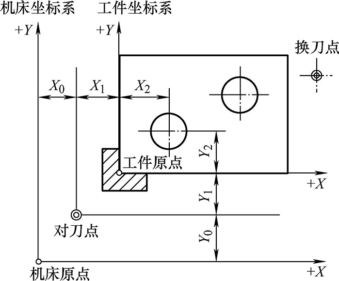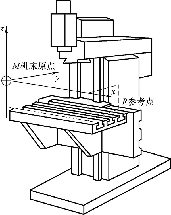 (2)机床原点 机床原点(或称机床零点)即机床坐标系的原点,是机床制造商设置在机床上的一个物理位置,又是数控机床进行加工或部件位置移动的基准点。数控机床经过设计、制造和调整后,这个原点便被确定下来,一般情况下不允许用户更改。机床原点的作用是使机床与控制系统同步,建立测量机床坐标系运动坐标( X 、 Y 、 Z 轴)的起始点。
