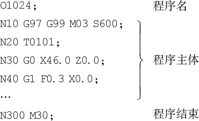 数控加工中,为使机床运行而送到CNC的一组指令称为程序。每一个程序都由程序名(程序号)、程序主体(程序内容)和程序结束三部分组成。