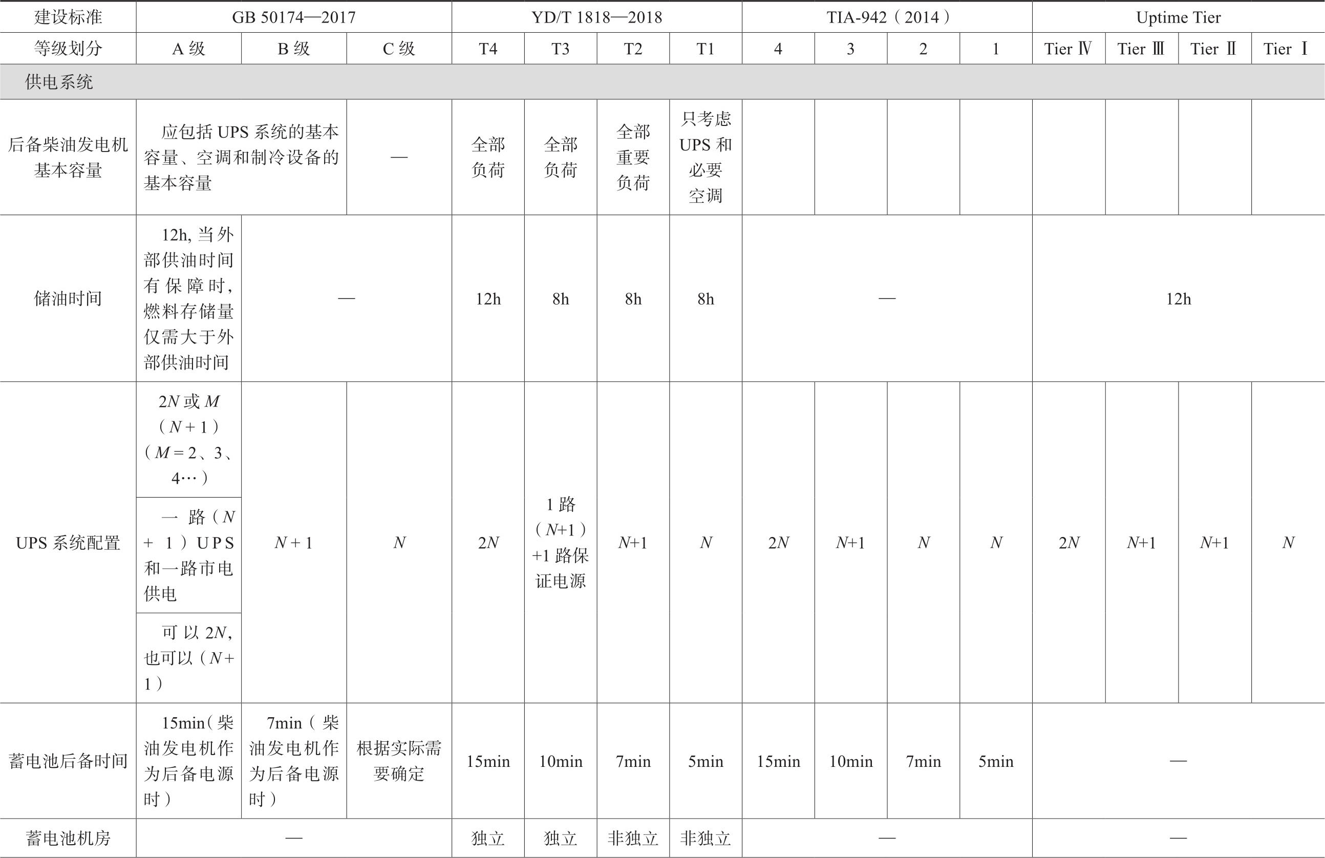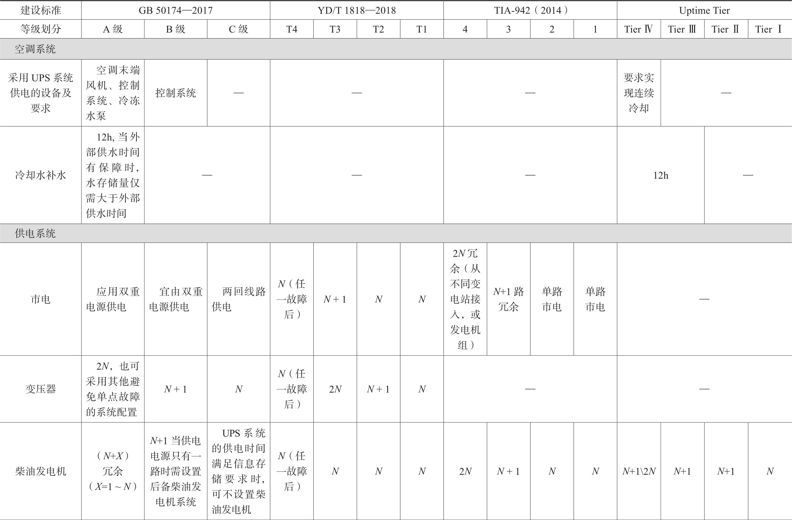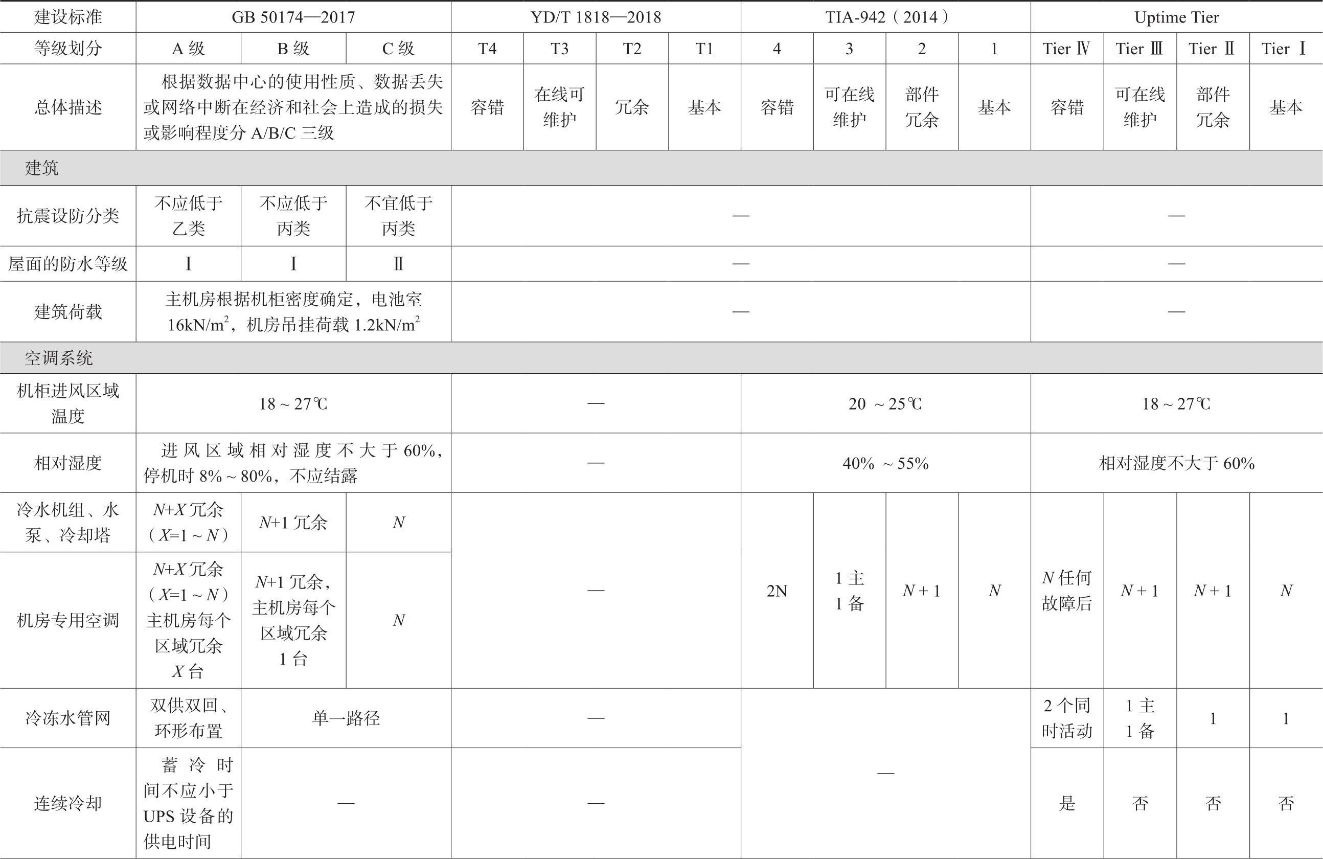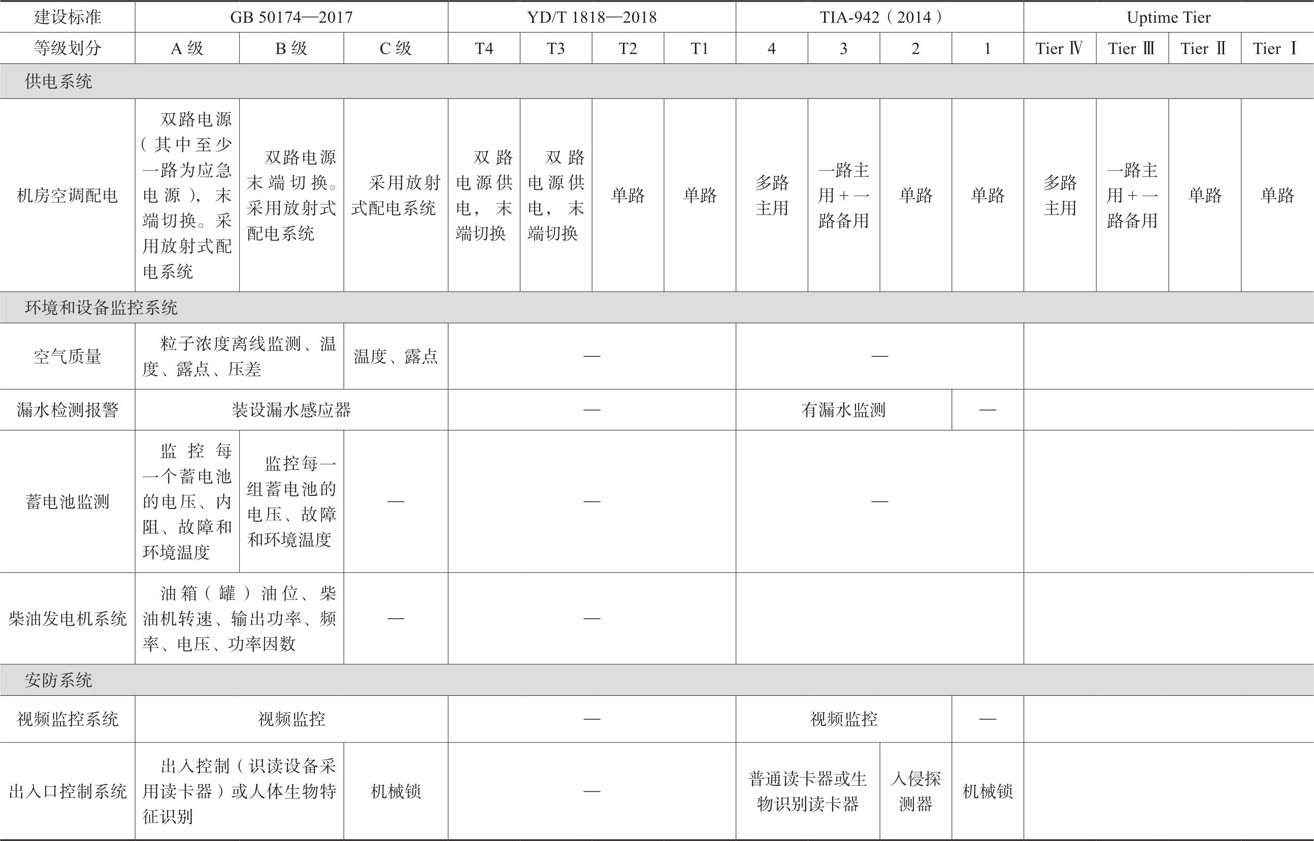 根据前文所述的不同标准,列出数据中心建设标准要求对比表,见表1-4。