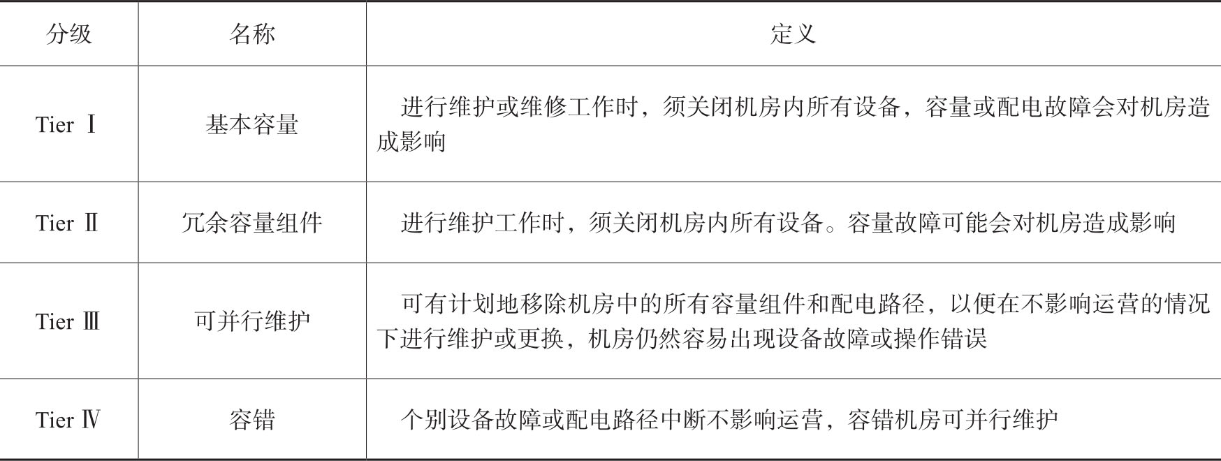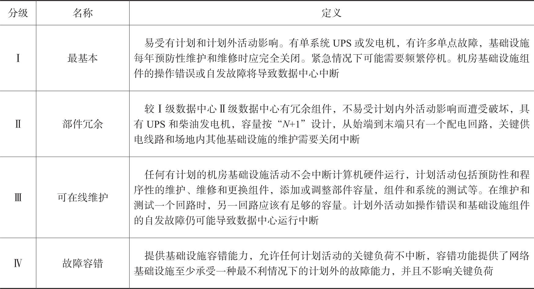 根据Uptime Institute最新中文版对数据中心四级Tier的定义,其标准下的数据中心分级见表1-2。