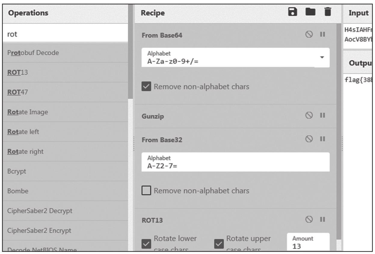 在Operations中搜索Magic模块,并拖入Recipe中,Magic会检测输入可能采用的编码方式,并显示解码结果。Magic的设置如图1.1.8所示,Depth处可以选择解码的层数,也就是解码几次,其默认值一般是3或4。在浏览器的右下角可看到解码后的结果(如图1.1.9所示):synt{38o2o3pq-rqqr-4895-83p4-n768pqn3732o}。“synt”是一个特征值,希望各位读者牢牢记住,它是“flag”经ROT13处理后的结果,大家可以先记住这个结果。ROT13属于古典密码的范畴,所以在本章中没有讲解,我们将在后续的密码学章节中详细说明。单击图1.1.9左侧框中的字符,相关编码信息将显示在图1.1.10的“Recipe”中。我们在Recipe中添加ROT13的模块,就能看到最终结果:flag{38b2b3cd-edde-4895-83c4-a768cda3732b}。在图1.1.9的右侧,可以看到“Entropy”的值,它表示结果的熵值。如果通过Magic模块得到多个结果,我们要优先选择熵值最小的结果进行分析,因为信息熵的值越小,数据越接近人可以理解的明文信息。