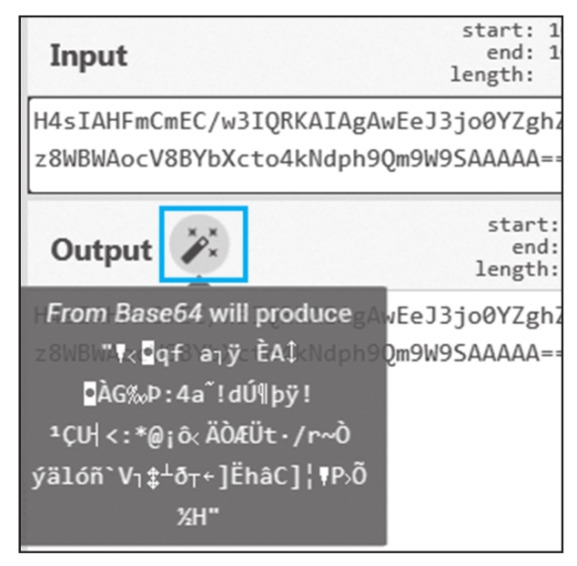 除了Magic模块,CyberChef还有个“魔法棒”功能,如图1.1.11所示。首先,在Recipe中没有选择任何模块,在Input中输入待处理的字符串,即可看到在Output右边出现了一个“魔法棒”,它其实就是CyberChef检测出的输入可能对应的编码或压缩类型。单击“魔法棒”,会在Recipe中自动添加相应的功能模块,并在Output显示处理结果。如果Output中也出现了“魔法棒”,我们可以一直单击,直到它不再出现为止。“魔法棒”给解码工作带来了极大的方便,但有时候它的检测结果是错误的,而且如果输入采用的编码层数过多,“魔法棒”也会失效。