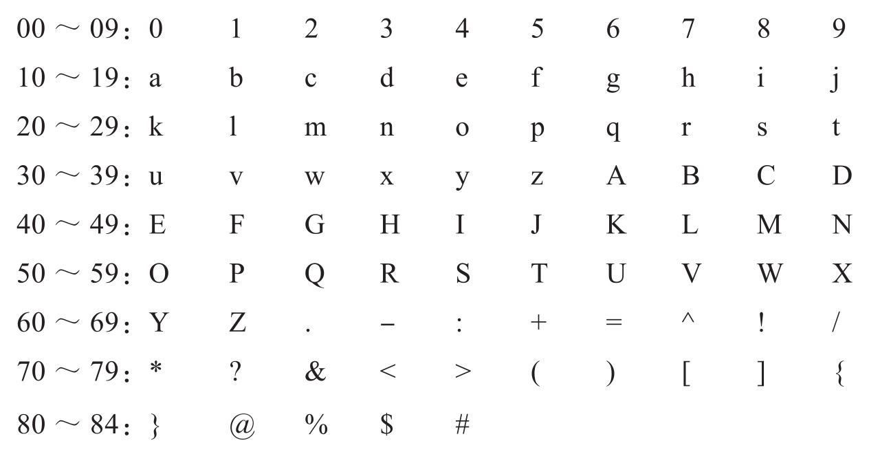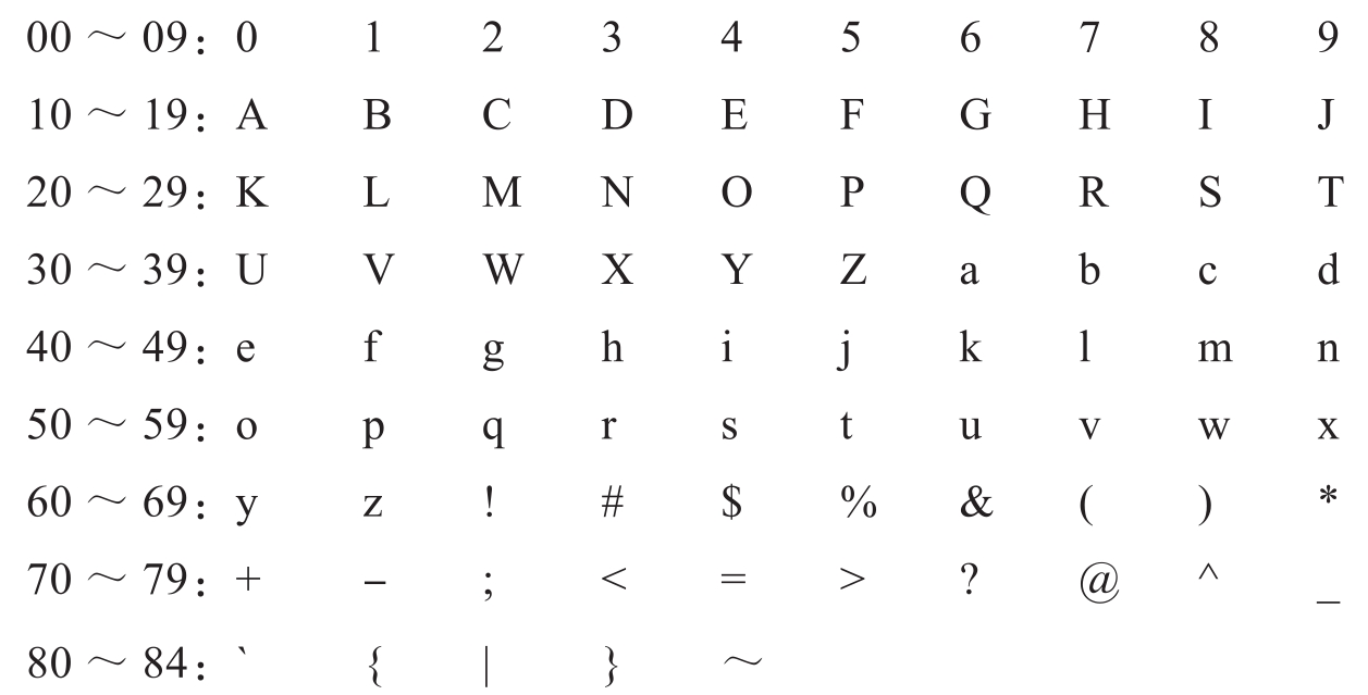 RFC1924是针对IPv6地址的一种编码方式。原始IPv6地址需要32字节表示,经过这种方式编码,仅用20字节就可以表示一个IPv6地址(https://tools.ietf.org/html/rfc1924)。其索引表如下:
