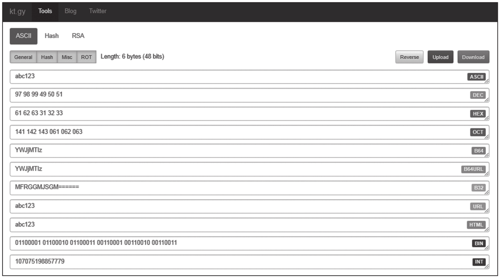 Base64的解码过程和编码过程类似,首先查Base64编码的标准索引表,将信息转换为二进制数据,根据等号数量确定丢弃的比特的范围(即上例中的带有下划线的部分,2个等号意味着丢弃4比特信息;1个等号意味着丢弃2比特信息),再以8比特为一组恢复出原始数据。在Koczkatamas工具包中将Base64字符串复制到B64行,即可在第一行(ASCII)看到解码后的内容。
