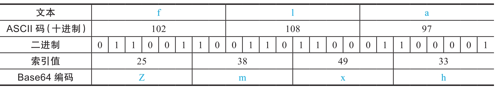 我们以字符串“fla”为例,展示Base64的编码过程。编码步骤如下所示: