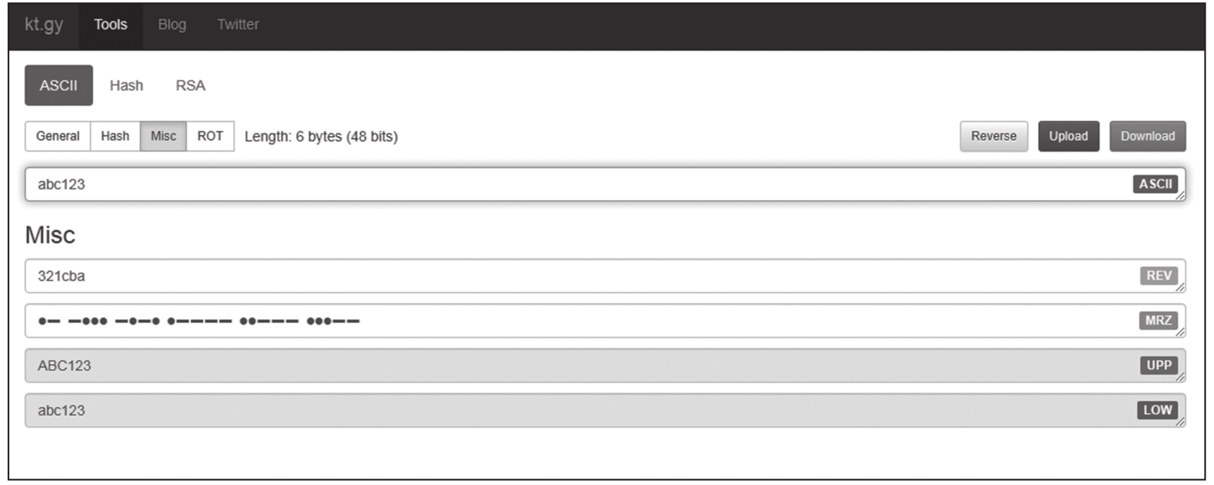 在第一行(ASCII)输入任意字符串,下面的编码都会随之变化。如果不变化,则说明工具不能使用,建议使用本书自带的离线版工具。DEC表示字符ASCII码的十进制形式,HEX表示字符ASCII码的十六进制形式,OCT表示字符ASCII码的八进制形式。