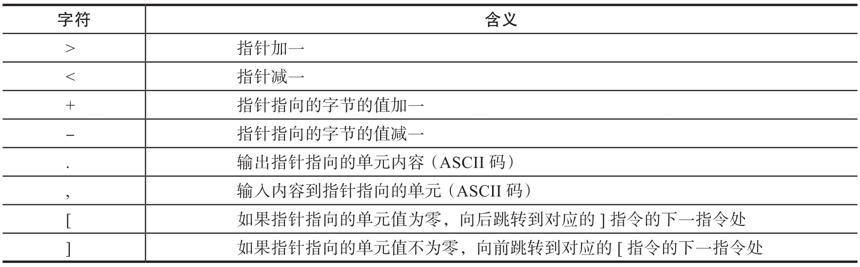 表1.1.6 Brainfuck字符的含义