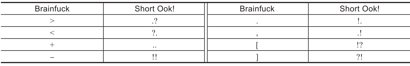 表1.1.8 Short Ook!与Brainfuck的对应关系
