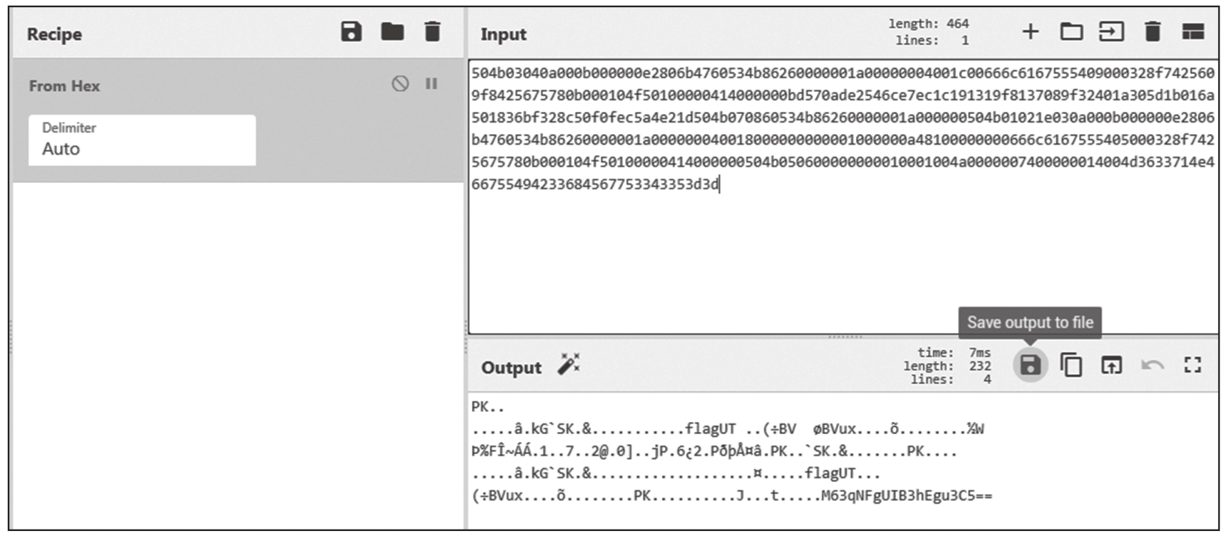 Base16的解码方法是:在Koczkatamas工具包中将字符串复制到HEX行,即可在第一行(ASCII)看到解码后的内容。如果需要将Base16解码成文件,可以使用CyberChef中的From Hex,如图1.1.2所示,再单击“Save output to file”按钮,即可保存为文件。
