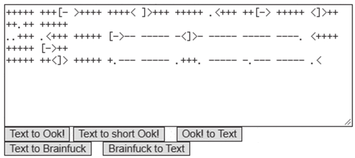 如果输出结果较为规范,则应该是5个字符为一组,每组以空格分隔,代码开头部分有若干加号,这些可以作为识别Brainfuck代码的明显特征。Brainfuck代码还有变形,分别是Ook!和Short Ook!代码。