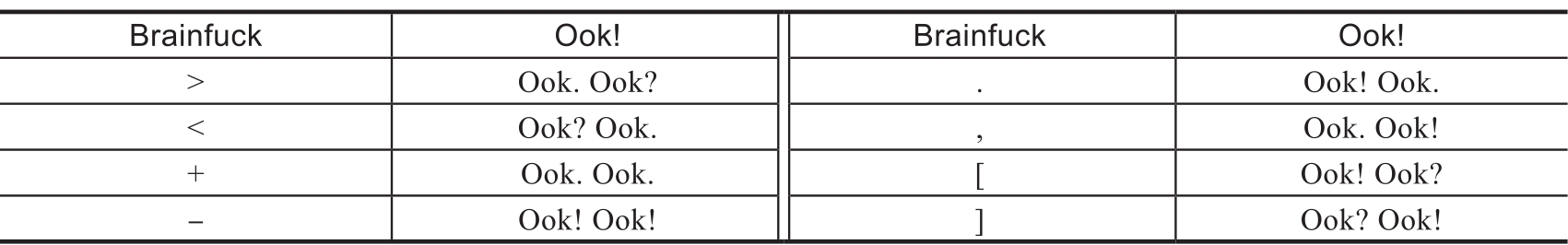 Ook!是一种由David Morgan-Mar创建的编程语言,它与Brainfuck完全相同,只是指令被改成了其他表示形式。Ook!只包含3种符号:Ook.,Ook!和Ook?,见表1.1.7,这也导致Ook!编码的特征过于明显。