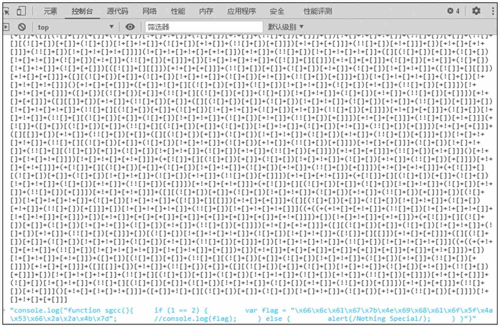 注意,JSFuck代码和JavaScript代码不是一一对应的关系。一般而言,规范书写的JavaScript代码都能转换成JSFuck代码,但JSFuck代码不一定都能转换成JavaScript代码。在CTF比赛中,JSFuck常用于JavaScript的加密,需要选手运行JSFuck代码或者手工解密,读懂代码内部逻辑。