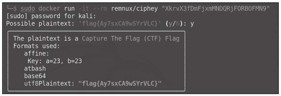 【解题思路】 题目中的字符串看起来是一个Base64编码的字符串,但将其解码后看不出任何特征,并且使用CyberChef的Magic或“魔法棒”也没有出现任何提示,此时可考虑使用工具Ciphey。根据Ciphey官网的描述,我们可采用Docker的方式进行安装,也可以使用pip安装,这里不再详细介绍安装步骤。本题运行Ciphey的结果如图1.1.12所示,得到flag{Ay7sxCA9wSYrVLC}。可以看到,结果中采用了仿射加密等方式,这是CyberChef中无法自动处理的,但是Ciphey可以自动识别。感兴趣的读者可以用Ciphey对上一个例题(easyencode.txt)进行解码,会发现Ciphey处理失败。这是因为上一个例题采用gunzip压缩,CyberChef对其有较好的识别效果,但Ciphey不能正确处理。因此,在比赛时,大家要灵活使用这两个工具。