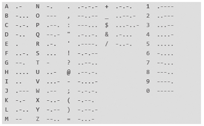 摩斯码一般是指莫尔斯电码,也称作摩斯密码,它是由美国人萨缪尔·莫尔斯在1837年发明的。摩斯码是由 点(.) 和 划(-) 这两种符号组成的信号代码,通过不同的排列顺序来表达不同的英文字母、数字和标点符号。其中,点作为一个基本的信号单位,划的长度相当于3个点的时间长度;在一个字母或数字之内,每个点、划之间的间隔应该是两个点的时间长度;字母(数字)与字母(数字)之间的间隔是7个点的时间长度。摩斯码主要由以下5种代码组成: