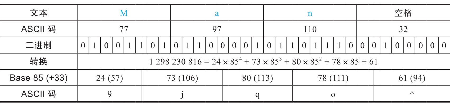 Base85是在Base64的基础上进一步压缩数据。Base85主要应用在PDF文档以及Git使用的二进制文件的补丁中。其编码原理为:用5个字符来表示4个字节。Base85还可以细分为标准型、ZeroMQ(Z85)和RFC1924三种。