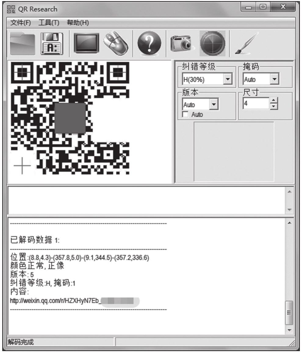 这里我们不准备讲解二维码的所有生成和扫码细节,读者们知道上述各区域的功能和位置即可。在平时的练习过程中,遇到二维码后可以用手机扫描,但是一些CTF比赛不让使用手机,因此我们需要提前准备好离线扫描工具,这里强烈推荐QR Research(工具包中)。该工具在Windows10系统下运行可能会有问题,建议在Windows7虚拟机中运行。使用方法为,双击CQR.exe,如图2.5.4所示,“鼠标”按钮是区域解码,可以选择指定区域后解码;其左侧的“屏幕”按钮是全屏解码,会把当前屏幕中的二维码解码。图中的二维码有遮挡且位置探测图形缺失,但是QR Research仍然可以解码成功。