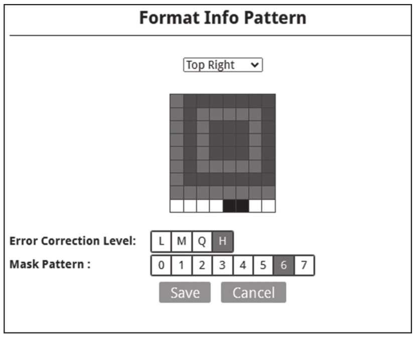 然后单击图中的蓝色方格,这个位置对应QR码的“格式信息”,如图2.5.9所示。我们需要选择纠错级别和掩码图形,这里需要经过多次尝试,与PNG图中格式信息图形相一致,最后确定纠错级别是H,掩码图形是6。