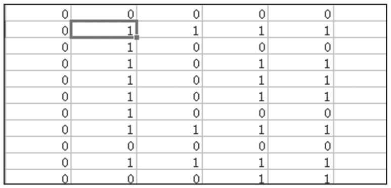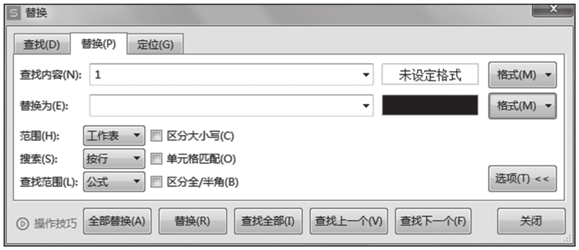 这时重点关注文本长度,729是27的平方,考虑可能是二维码的变形。将字符串整理为27个字符一行,并增加空格(可利用替换功能快速完成),如图2.5.5所示,不难看出这是个二维码,但是无法扫码,我们需要根据01把QR码画出来。这里提供两种思路:①写脚本画图。②利用Excel画图。我们演示思路②的操作。把整理后的文档保存成txt文件。新建Excel文件,单击“文件”菜单,选择“打开”,再选择整理后的TXT文件,然后选择“分隔符号→空格”,导入后如图2.5.6所示。选中内容为1的单元格,用<Ctrl+f>组合键打开替换窗口,选择“选项”,替换方法如图2.5.7所示,通过设置格式将背景变成黑色。调整单元格宽度,使得二维码呈正方形,扫码后就得到Flag{fucbw5rxlx}。