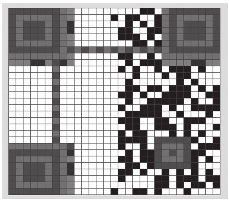 二维码就是在二维矩阵相应元素位置上用“点”表示二进制“1”,用“空”表示二进制“0”,用“点”和“空”的排列组成的图像。在定位准确的前提下,只要扫码设备读取到的位置有一个黑点——哪怕只是非常小的黑点,都不妨碍它被识别为“1”,浅色的地方自然就被识别为“0”。如图2.5.1所示,大家可以扫码尝试。扫描则是靠明暗差异来识别二维码,所以二维码是否由小方块组成并没有影响,但一定要用对比鲜明的颜色。如果二维码被设置成了深灰+浅灰,就很难被识别出来。