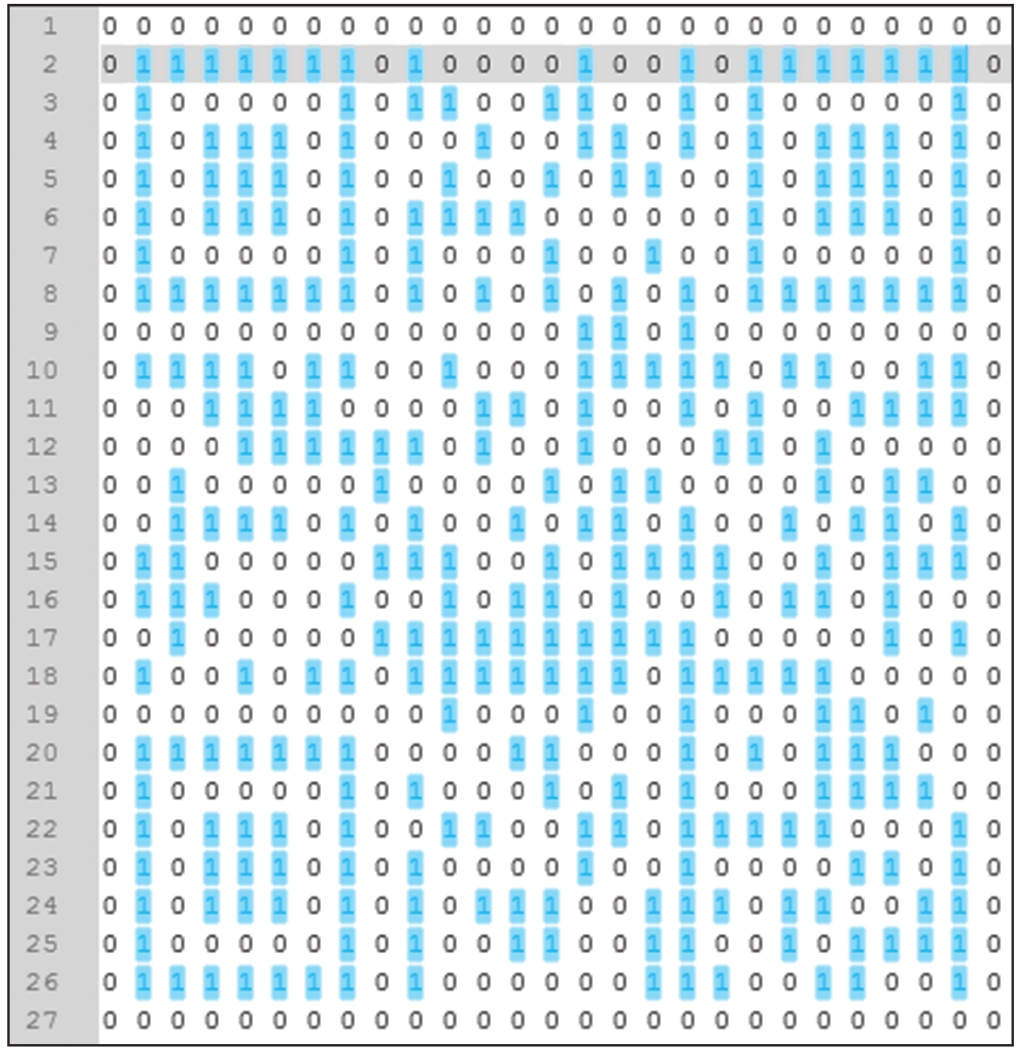 【解题思路】 TXT文件中是01字符串,因此我们首先想到二进制。如果采用二进制表示信息,我们习惯用8比特表示一个字节。因此,二进制信息流的长度通常是8的倍数。但本例中信息总长度是729字节,729不能被8整除,我们猜测题目的考点并不是二进制。