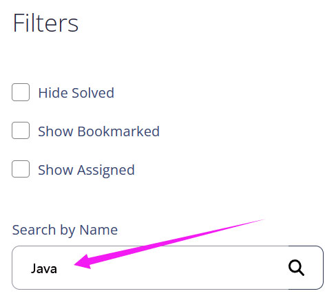 PicoCTF的练习界面十分友好,可以通过搜索框直接查找自己感兴趣的题目。例如,要搜索与Java有关的题目,可以使用直接搜索关键词“Java”,如图1-5所示。