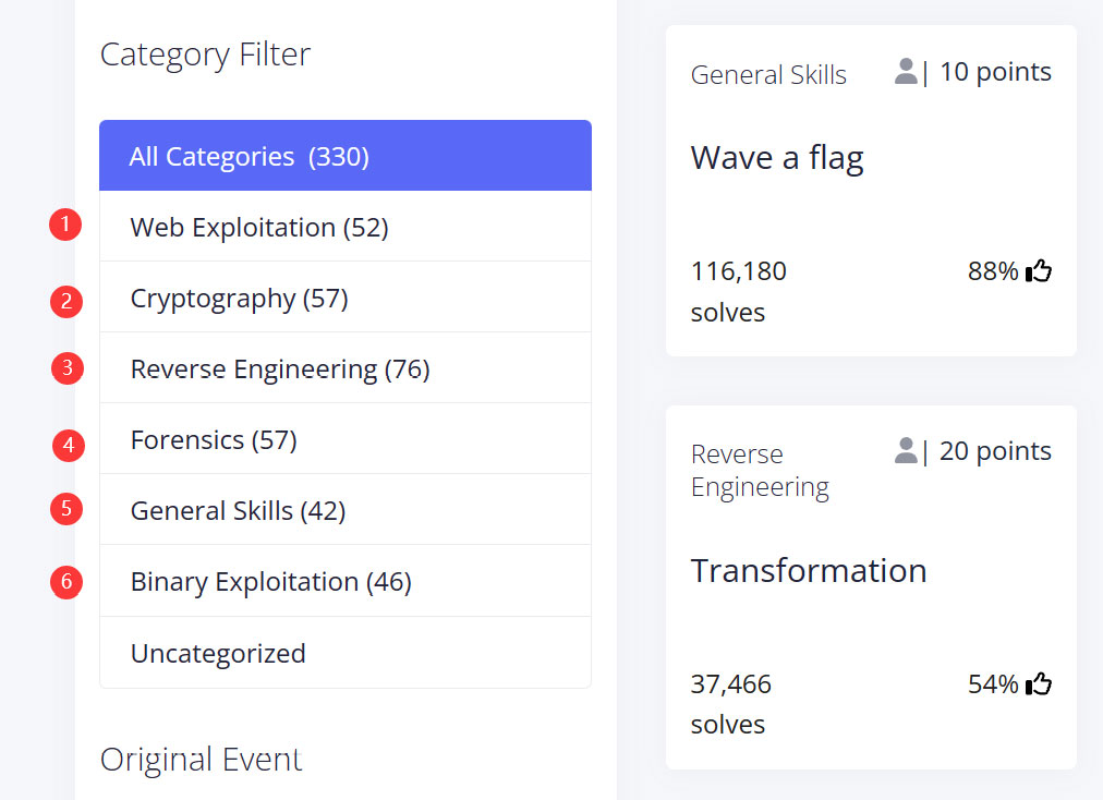 PicoCTF将所有题目分成了多个大类,这其实也是几乎所有CTF比赛都会采用的方案。因为“术业有专攻”,一个人不可能同时精通所有的网络安全知识体系,所以CTF比赛几乎都以团队形式参赛,由团队成员分别解答自己擅长的题目。